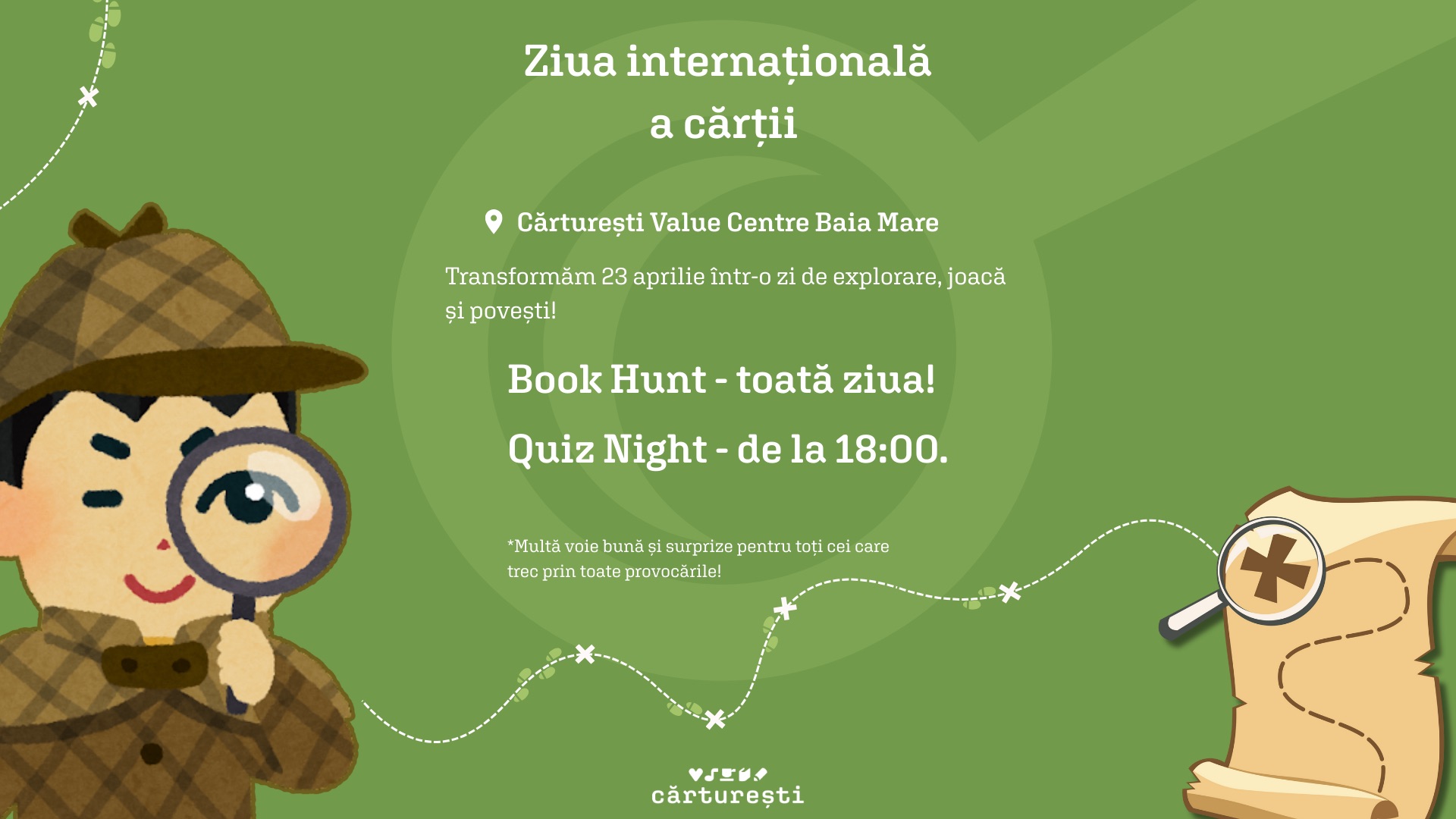 ”Transformăm librăria într-un spațiu al jocului și al curiozității: Book Hunt – o vânătoare de comori literare care te poartă prin toate colțurile librăriei, pe parcursul întregii zile; Quiz Night Bookish, de la ora 18:00 – o seară relaxată, cu întrebări pentru cititorii pasionați și multă voie bună”, anunță reprezentanții Cărturești Baia Mare pe pagina de Facebook.