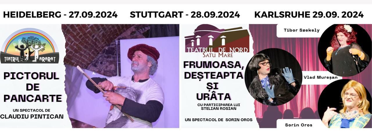 În perioada 27-29 septembrie, două spectacole românești de teatru se vor juca în Germania. Locațiile sunt Hirtenberg, Stuttgart și Karlsruhe.