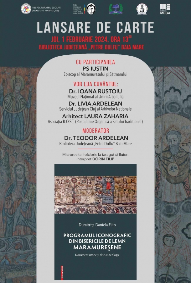 Joi, 1 februarie, de la ora 13.30, Biblioteca Județeană „Petre Dulfu” din Baia Mare va găzdui lansarea cărții „Programul iconografic din bisericile de lemn maramureșene: document istoric și discurs teologic”, autor dr. Dumitrița Daniela Filip.
