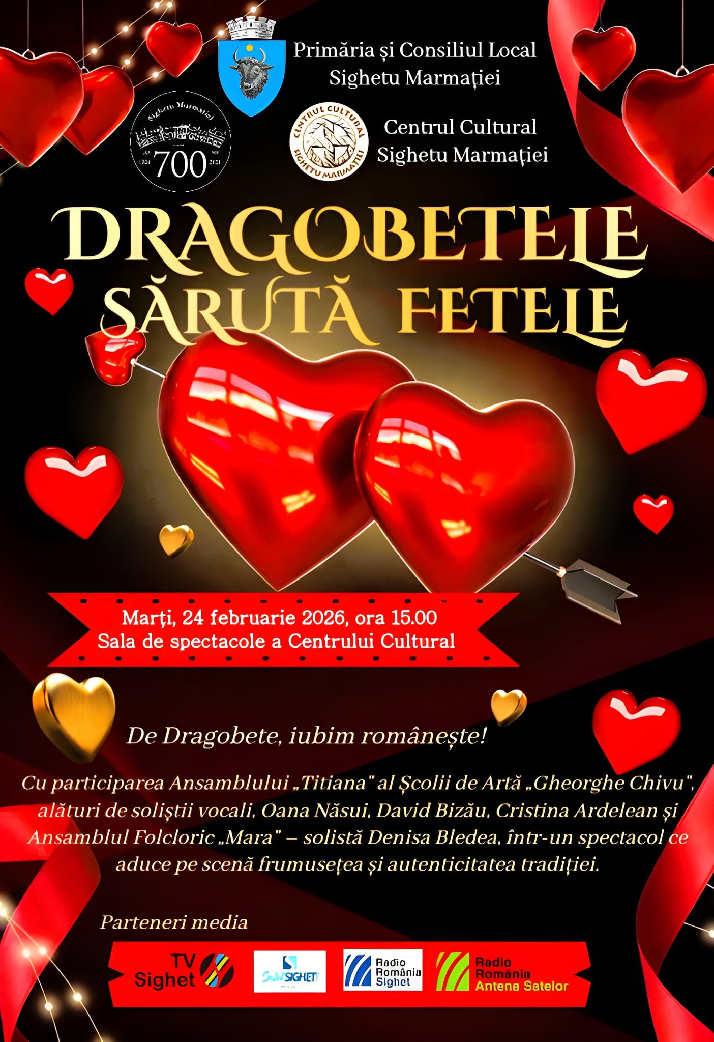 Pe 24 februarie, românii sărbătoresc Dragobetele, ziua iubirii tradiționale, iar Sighetu Marmației devine scena unui spectacol dedicat acestei frumoase sărbători. Evenimentul „Dragobetele sărută fetele” va avea loc marți, 24 februarie, de la ora 15.00, la Sala de spectacole a Centrului Cultural din municipiu. Se anunță culoare, emoție și autenticitate, aducând în prim-plan frumusețea tradițiilor românești.