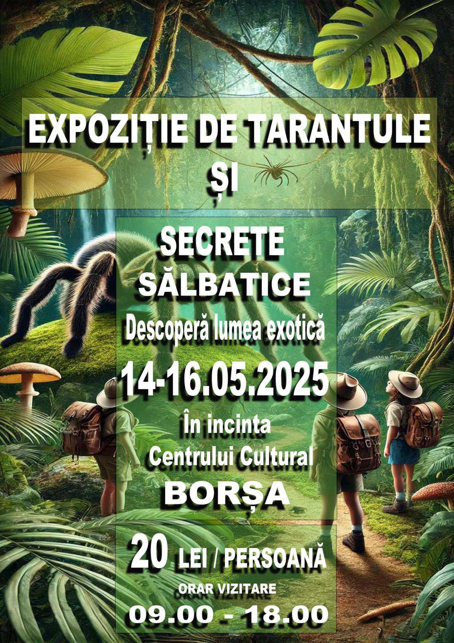 În perioada 14-16 mai, între orele 09:00 și 18:00, Centrul Cultural „Titiana Mihali” din Borșa va găzdui o expoziție de tarantule și secrete sălbatice.