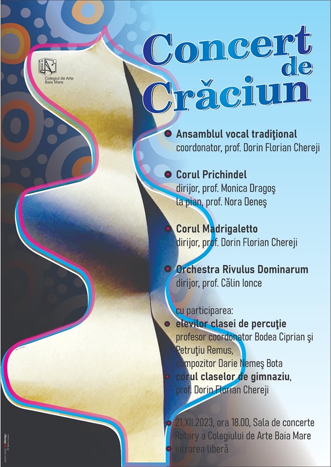„Elevi, părinți, prieteni și iubitori ai artei, cu bucurie vă invităm să participați la Concertul de Crăciun, susținut de elevii Colegiului de Arte. Împreună, vom trăi magia sărbătorilor prin interpretări muzicale impresionante. Vă așteptăm cu drag să vă alăturați nouă și să ne bucurăm împreună de spiritul Crăciunului”, transmite conducerea Colegiului de Arte Baia Mare.