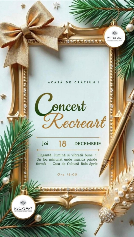 Școala de muzică „Recreart” din Baia Mare organizează, joi, 18 decembrie, concertul dedicat sărbătorilor de iarnă „Acasă de Crăciun”, care va avea loc de la ora 18:00 la Casa de Cultură Baia Sprie.