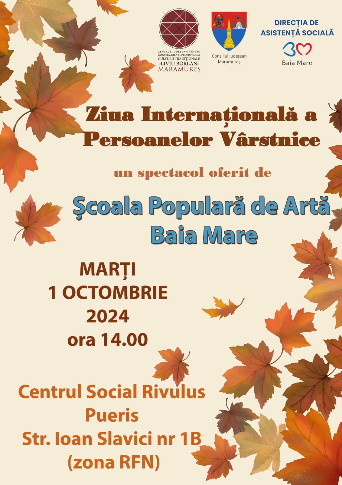 În 1 octombrie, de Ziua Internațională a Persoanelor Vârstnice, Școala Populară de Artă Baia Mare din cadrul CJCPCT „Liviu Borlan” Maramureș (manager prof. Lucian Iluț) va oferi momente artistice muzicale de excepție vârstnicilor de la Centrul Rivului Pueris Baia Mare, în parteneriat cu Direcția de Asistență Socială Baia Mare