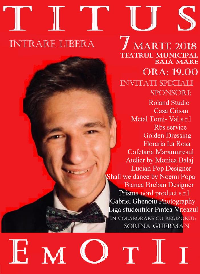 Miercuri, 7 martie, orele 19.00, Titus vă invită la Teatrul Municipal Baia Mare la primul său concert ”Emoții”, pe care îl va susține alături de invitații săi. ”Emoțiile” sale sunt împărtășite în colaborare cu regizorul Sorina Gherman.