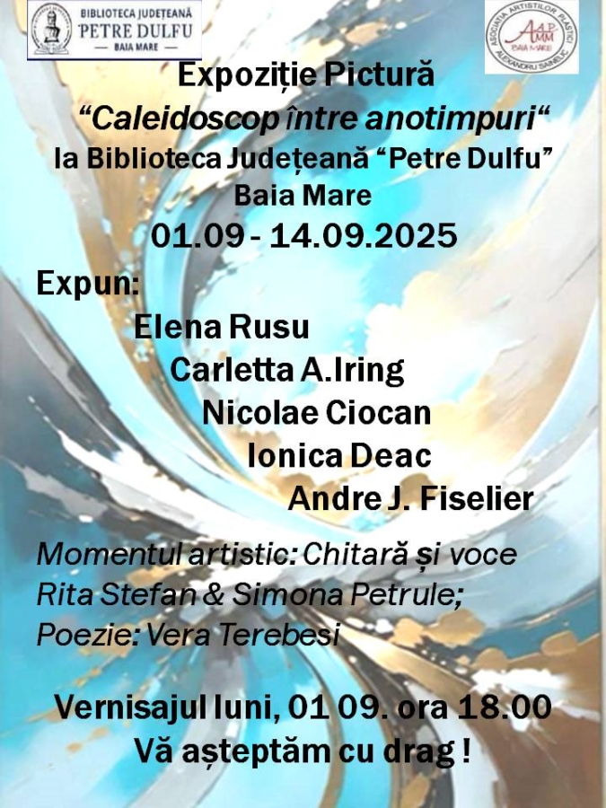 Biblioteca Județeană „Petre Dulfu” organizează vernisajul expoziției de pictură „Caleidoscop între anotimpuri”, a membrilor Asociației Artiștilor Plastici „Alexandru Șainelic”, în data de 1 septembrie. Expoziția va putea fi vizitată la Salonul Artelor în perioada 1-14 septembrie, conform programului bibliotecii.