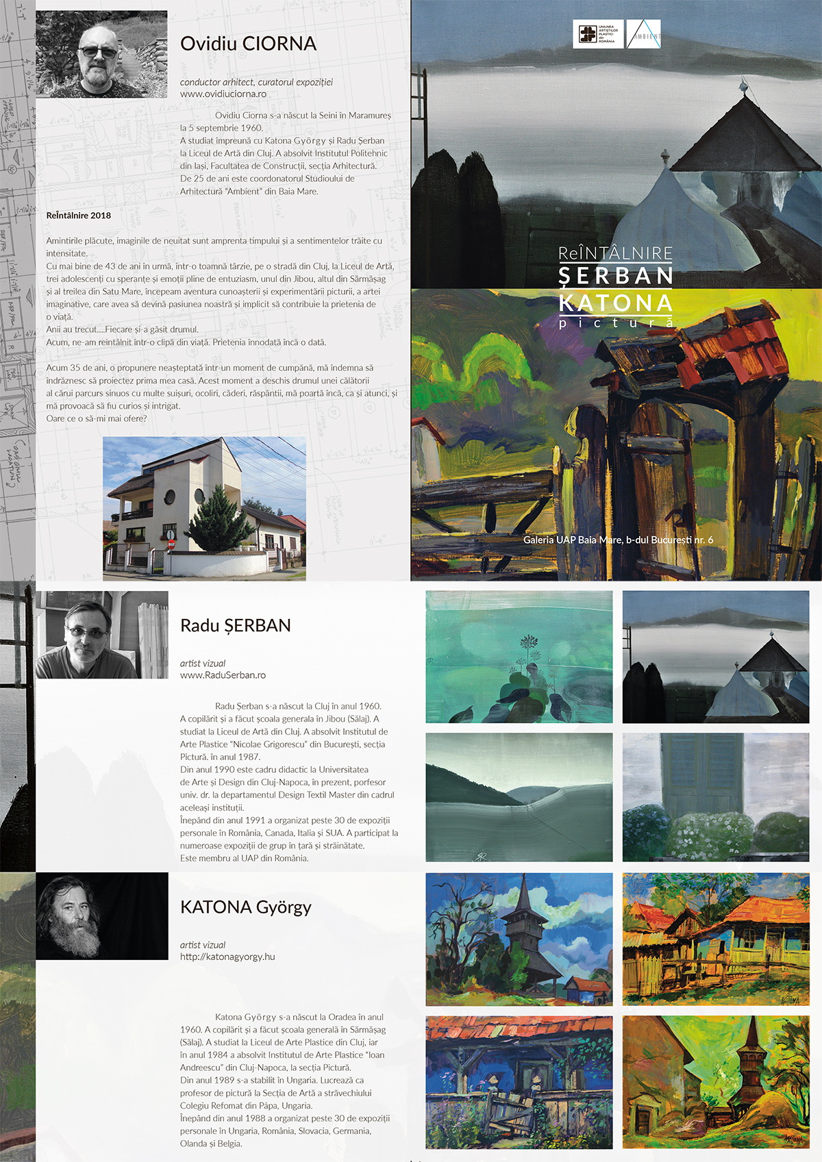 Joi, 12 iulie, de la orele 18.00, la Galeria UAP Baia Mare (bdul București nr. 6) va avea loc vernisajul expoziției de pictură ”Reîntâlnire”. La mai bine de patru decenii distanță de liceul de artă se reîntâlnesc trei colegi și prieteni: Radu Șerban și Gyorgy Katona, în calitate de expozanți, și Ovidiu Ciorna, în cea de curator. Organizatori: UAP Baia Mare și Studioul de Arhitectură ”Ambient”.