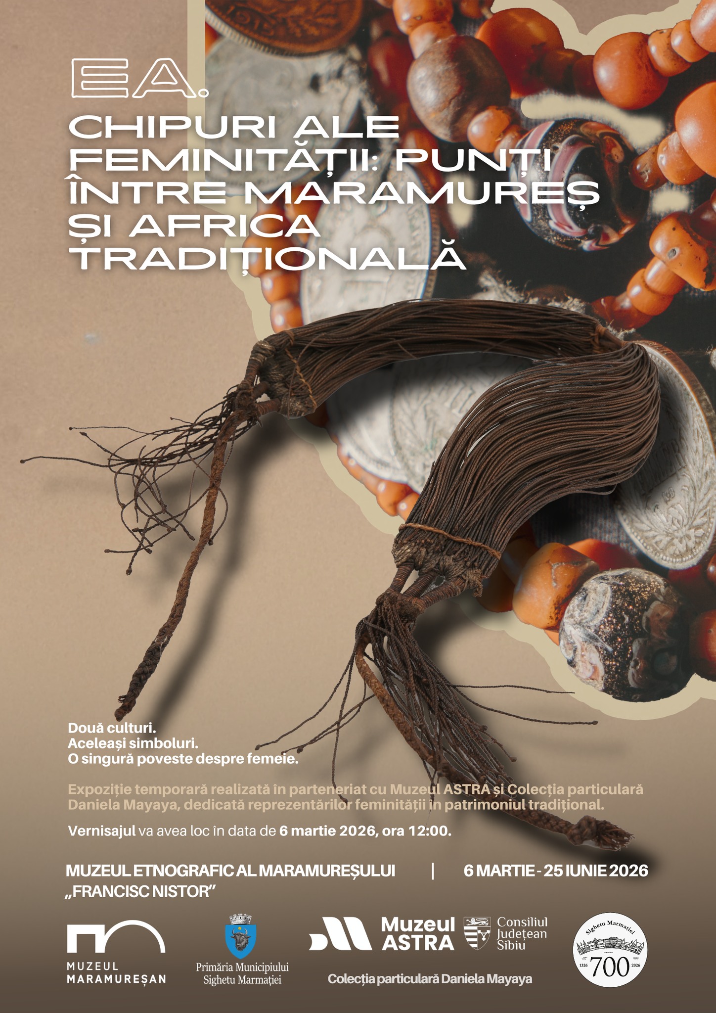 Expoziția „EA. Chipuri ale feminătății: punți între Maramureș și Africa tradițională” aduce împreună obiecte de patrimoniu care vorbesc despre viață, frumusețe, protecție, maternitate și memorie ca valori universale care au unit comunitățile umane dintotdeauna.
