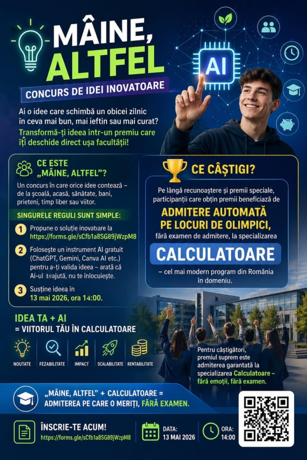 Facultatea de Inginerie, domeniul Calculatoare și Tehnologia Informației din cadrul Centrului Universitar Nord Baia Mare organizează concursul de idei inovatoare „Mâine, Altfel”, dedicat elevilor de liceu, pasionați de tehnologia modernă și inteligența artificială.