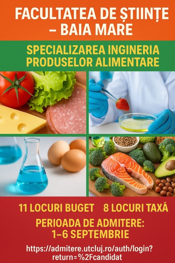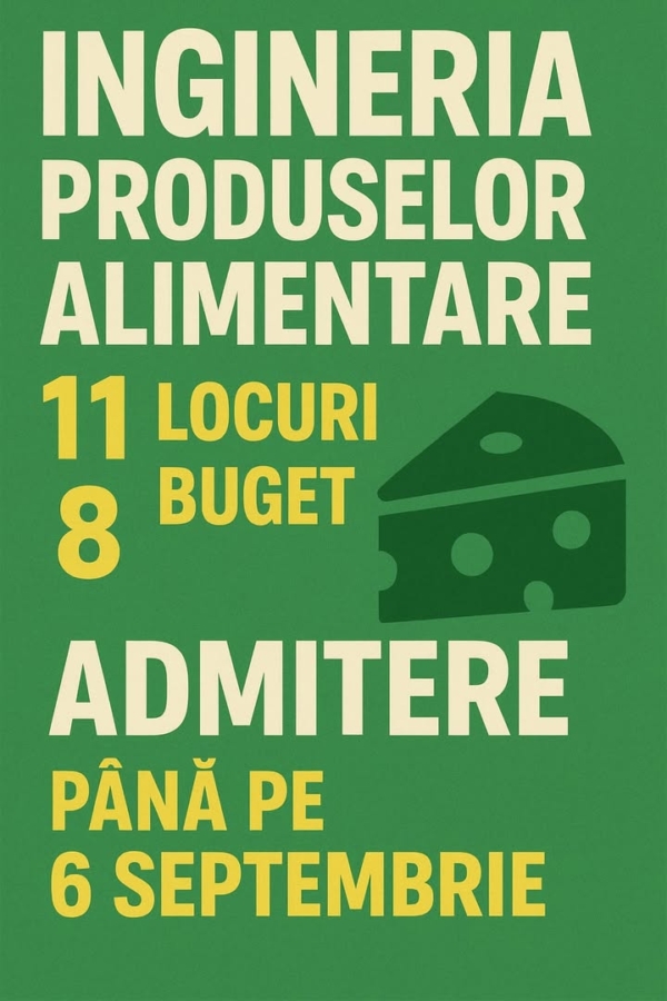 - Ingineria Produselor Alimentare – 11 locuri la buget, 8 locuri cu taxă.