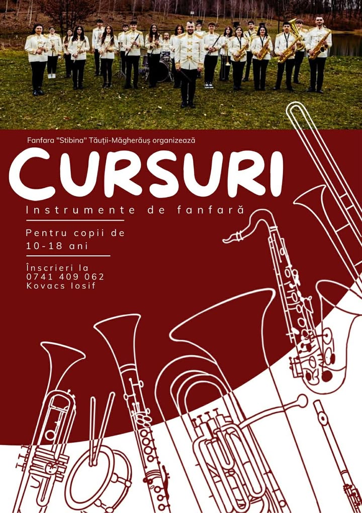 Fanfara „Stibina” din Tăuții-Măgherăuș anunță organizarea unor cursuri gratuite pentru copiii cu vârsta cuprinsă între 10 și 18 ani, pentru învățarea instrumentelor muzicale de suflat și percuție. Inițiativa se adresează tuturor pasionaților de muzică, indiferent de nivelul de experiență.