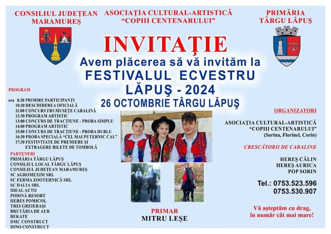 Sâmbătă, 26 octombrie, în Târgu Lăpuș va avea loc „Festivalul Ecvestru Lăpuş 2024”.