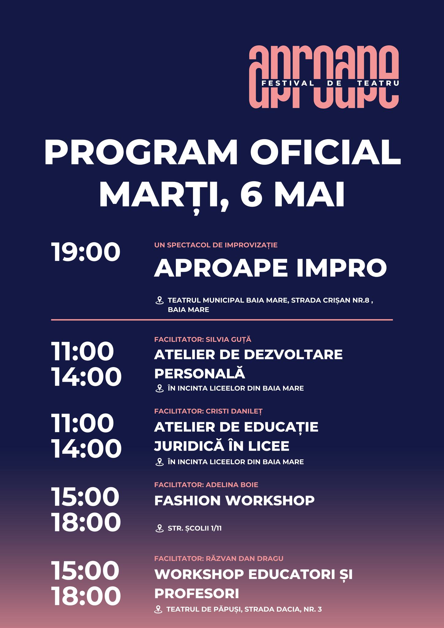 Programul de astăzi al Festivalului de teatru ”Aproape” cuprinde ateliere de dezvoltare personală și de educație juridică în licee, un fashion workshop, un alt workshop pentru educatori și profesori, două expoziții. Plus un spectacol, ”Aproape Impro”, de la 19, pe scena Teatrului Municipal.
