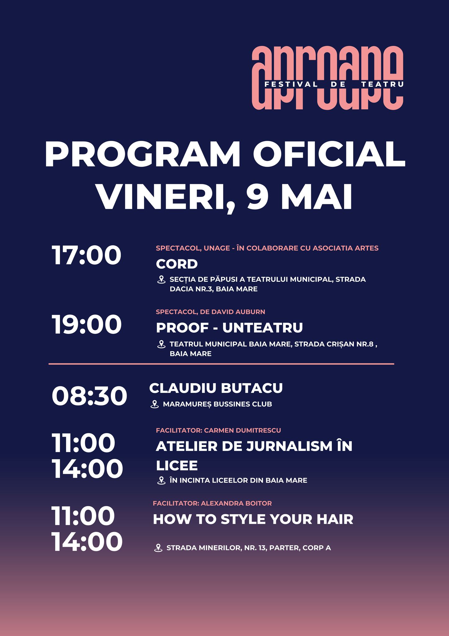 În programul de astăzi al Festivalului de teatru ”Aproape” se regăsesc un atelier de jurnalism pentru liceeni, unul de hairstyling, precum și expoziția ”Mostra Arte”. De asemenea, două spectacole: ”CORD” și ”PROOF” (foto deschidere).