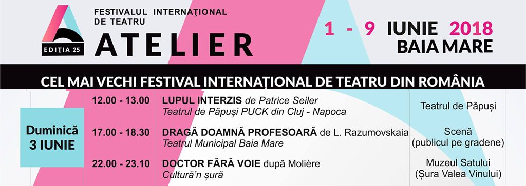 Duminica din Festivalul Internațional de Teatru ”ATELIER” stă sub semnul cifrei 3: e 3 iunie, e a 3-a zi a festivalului și oferă 3 spectacole. ”Lupul interzis” e regizat de directorul artistic al festivalului, Radu Dinulescu. Pretextul e povestea lupului cel rău, care n-o duce prea bine în era modernă și e nevoit și el să emigreze spre o ”pădure” mai bună. Și ”Dragă doamnă profesoară” a mutat acțiunea în Rusia de astăzi. ”Doctor fără voie” pornește de la textul clasic al lui Moliere, abordat mai la zi, cu o temă atemporală: impostura.
