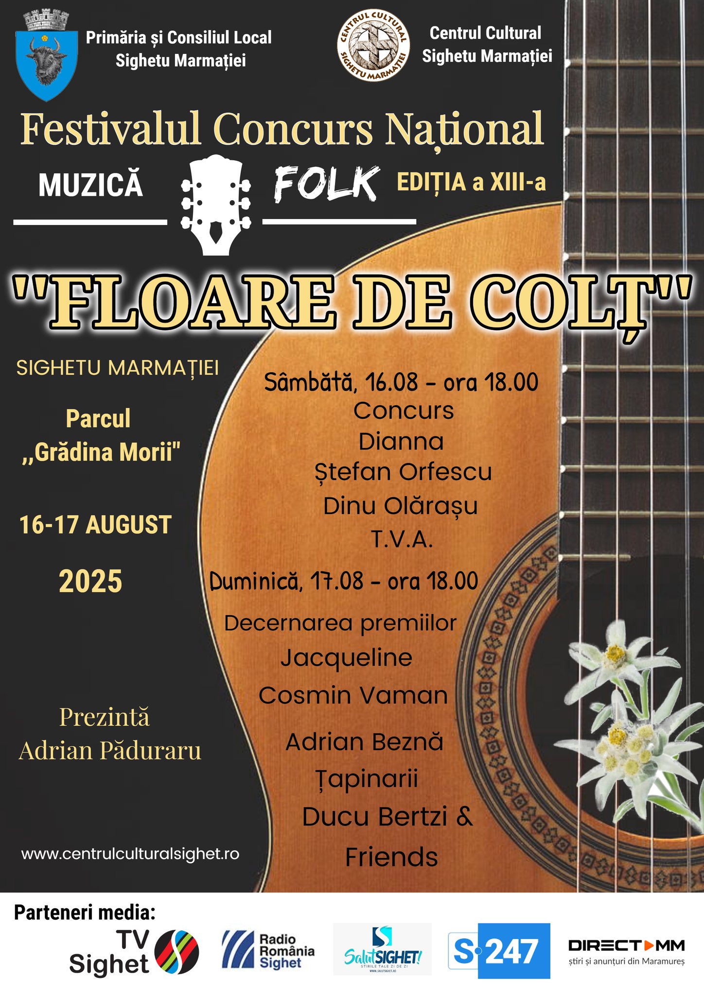 În perioada 16-17 august, frumosul parc „Grădina Morii din Sighetu Marmației va găzdui cea de-a XIII-a ediție a Festivalul Concurs de Muzică Folk „Floare de Colț”.