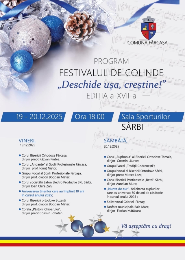 Festivalul de Colinde „Deschide ușa, creștine!”, ediția a XVII-a este una dintre cele mai îndrăgite tradiții ale comunei Fărcașa, Maramureș și va avea loc în perioada 19–20 decembrie 2025 la Sala Sporturilor din Sârbi, începând cu ora 18:00.