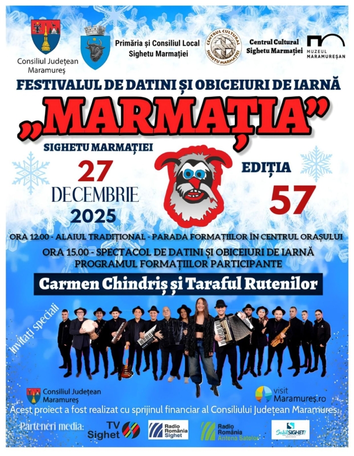 Cea de-a 57-a ediție a Festivalului de Datini și Obiceiuri de Iarnă „Marmația” va avea loc în data de 27 decembrie, reunind artiști de renume național, grupuri de colindători, precum și meșteri populari, în centrul orașului Sighetu Marmației.
