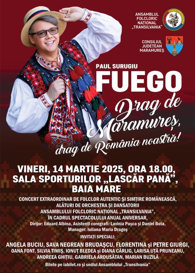 Spectacolul aniversar „Drag de Maramureș, drag de România noastră!”, al cărui protagonist va fi îndrăgitul artist Paul Surugiu (Fuego) care va cânta alături de Ansamblul Folcloric Național „Transilvania”, va avea loc pe data de 14 martie de la ora 18:00, la Sala Sporturilor „Lascăr Pană” din Baia Mare.