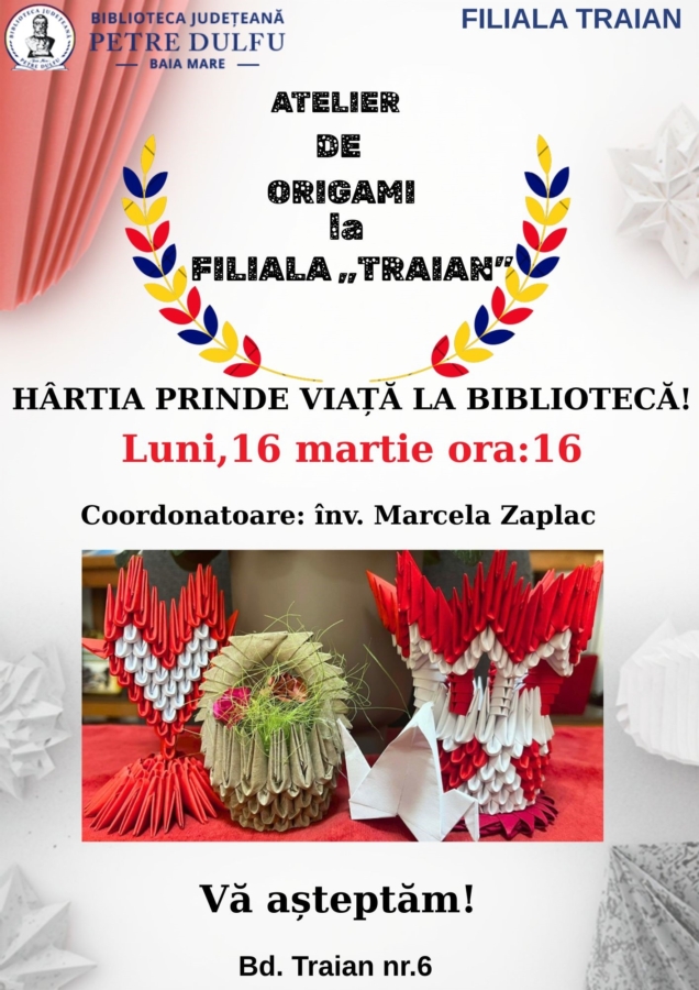 Filiala „Traian” a Bibliotecii Județene „Petre Dulfu” din Baia Mare găzduiește luni, 16 martie, un atelier de origami, de la ora 16:00.