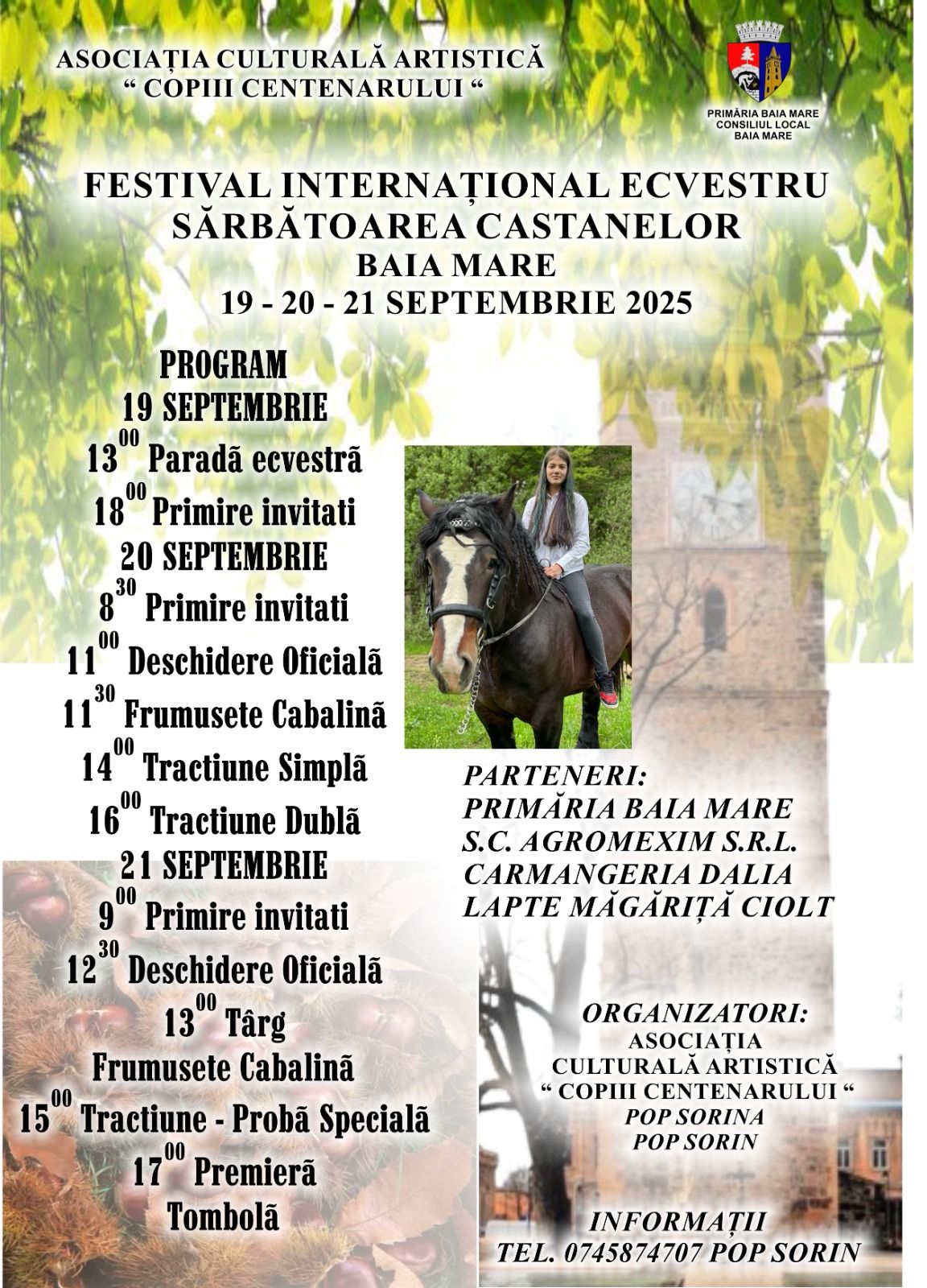 În perioada 19 – 21 septembrie, municipiul Baia Mare va găzdui Festivalul Internațional Ecvestru, un eveniment de tradiție integrat în renumita Sărbătoare a Castanelor. Manifestarea este organizată de Asociația Culturală Artistică „Copiii Centenarului”, în parteneriat cu Primăria Baia Mare și mai mulți sponsori locali.