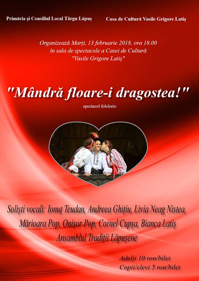 Marţi, 13 februarie , în ajun de „Ziua Îndrăgostiților, la Casa de Cultură din Târgu Lăpuș va avea loc spectacolul folcloric „Mândră floare-i dragostea!”. Evenimentul este organizat de Primăria Târgu Lăpuș și Casa de Cultură „Vasile Grigore Latiș”. Prețul unui bilet este de 5 lei pentru copii și 10 lei pentru adulți. (Adrian BUDA)