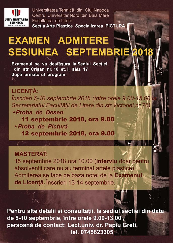 Secția de arte Plastice de la Facultatea de Litere din cadrul Centrului Universitar ”Nord” Baia Mare organizează sesiunea din septembrie de admitere la specializarea pictură, atât pentru licență,cât și pentru masterat. Iată mai jos toate amănuntele.