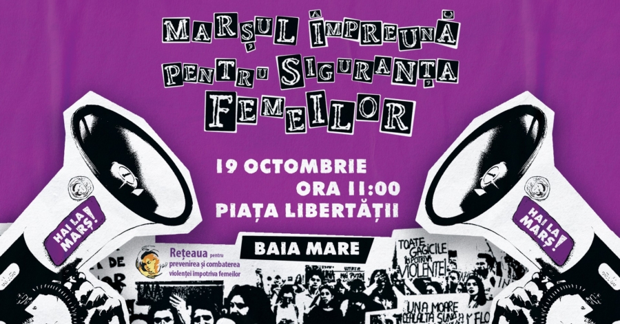 Duminică, 19 octombrie, Asociația Pirita Children organizează „Marșul pentru siguranța femeilor”, în Piața Libertății din Baia Mare, de la ora 11:00.