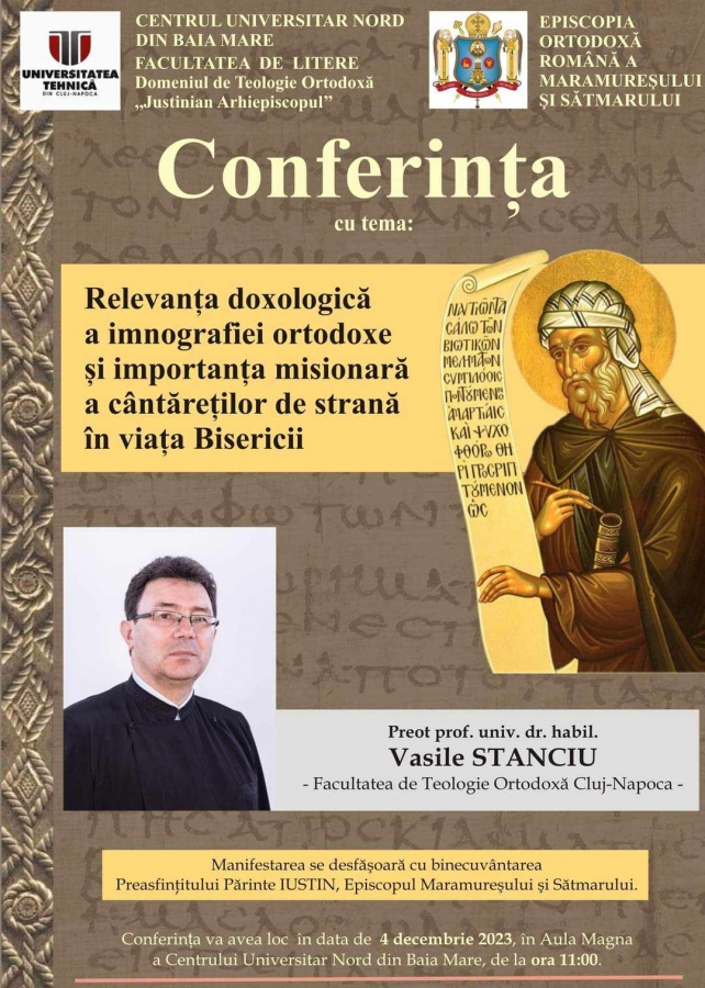 Azi, 4 decembrie, de la ora 11.00, Aula Magna a Centrului Universitar Nord Baia Mare va găzdui conferința cu tema „Relevanța doxologică a imnografiei ortodoxe și importanța misionară a cântăreților de strană în viața bisericii”.