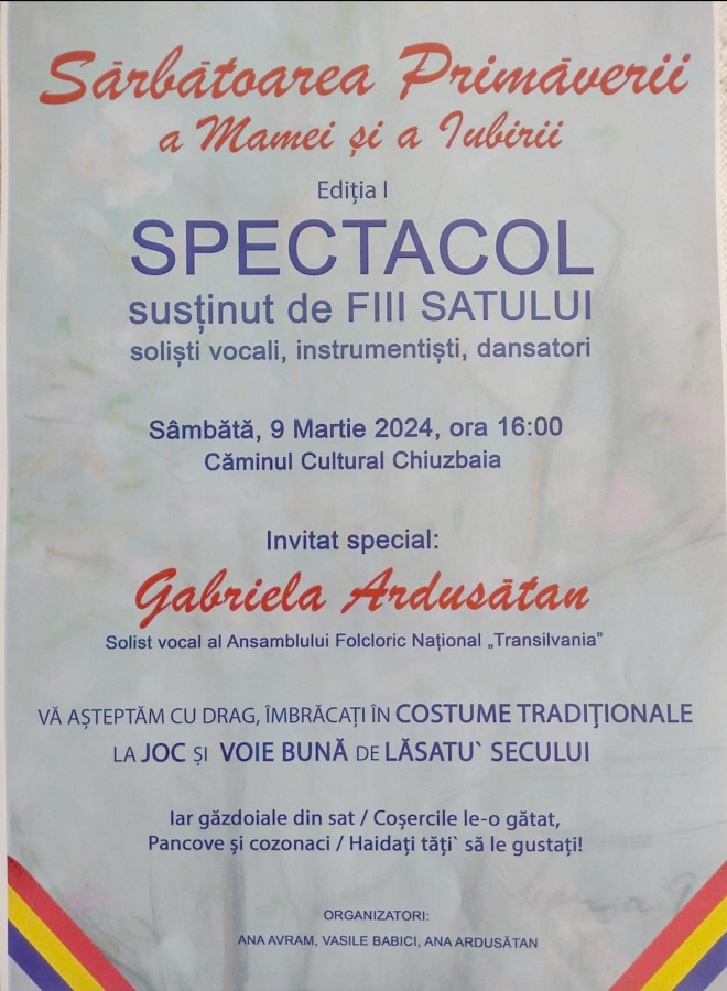 Sâmbătă, 9 martie, de la ora 16.00, Căminul Cultural din Chiuzbaia va găzdui prima ediție a „Sărbătorii Primăverii, a Mamei și a Iubirii”, spectacol susținut de fiii satului – soliști vocali, instrumentiști, dansatori.