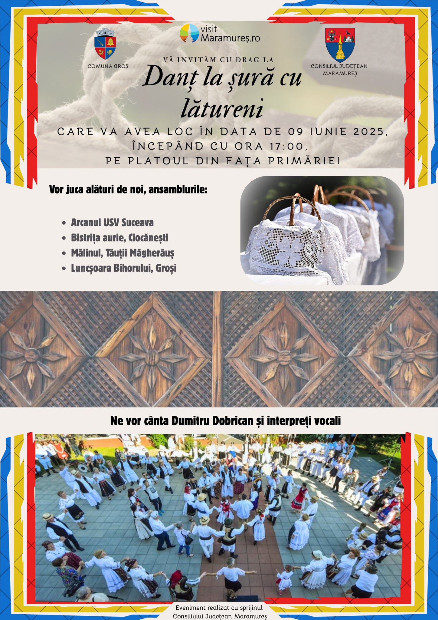 Luni, 9 iunie, în a doua zi de Rusalii, începând cu ora 17:00, pe platoul din fața Primăriei Groși va loc un eveniment de suflet. Este vorba despre Festivalul “Danț la șură cu lătureni”, care celebrează tradiția, portul și jocul popular.