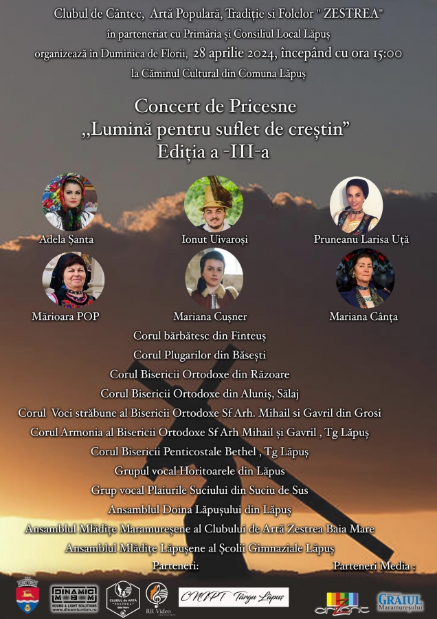 Duminică, 28 aprilie, de la ora 15.00, Căminul Cultural din comuna Lăpuș va găzdui cea de-a III-a ediție a concertului de pricesne „Lumină pentru suflet de creștin”.
