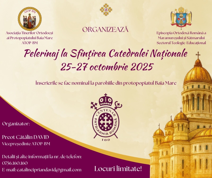 Cu binecuvântarea Preasfințitului Părinte Iustin, Episcopul Maramureșului și Sătmarului, în perioada 25–27 octombrie 2025, Protopopiatul Ortodox Român Baia Mare prin Asociația Tinerilor Ortodocși ai Protopopiatului Baia Mare–ATOP BM și Agenția Pelerinul Creștin organizează, pentru credincioși, un pelerinaj la sfințirea Catedralei Naționale din București.