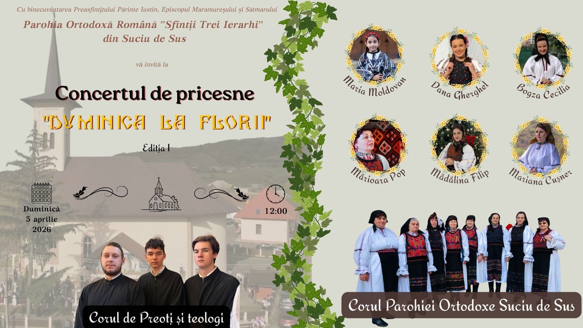 Cu binecuvântarea Preasfințitului Părinte Iustin, Episcopul Maramureșului și Sătmarului, Parohia Ortodoxă „Sfinții Trei Ierarhi” Suciu de Sus organizează prima ediție a concertului solemn de pricesne „Duminica La Florii”.