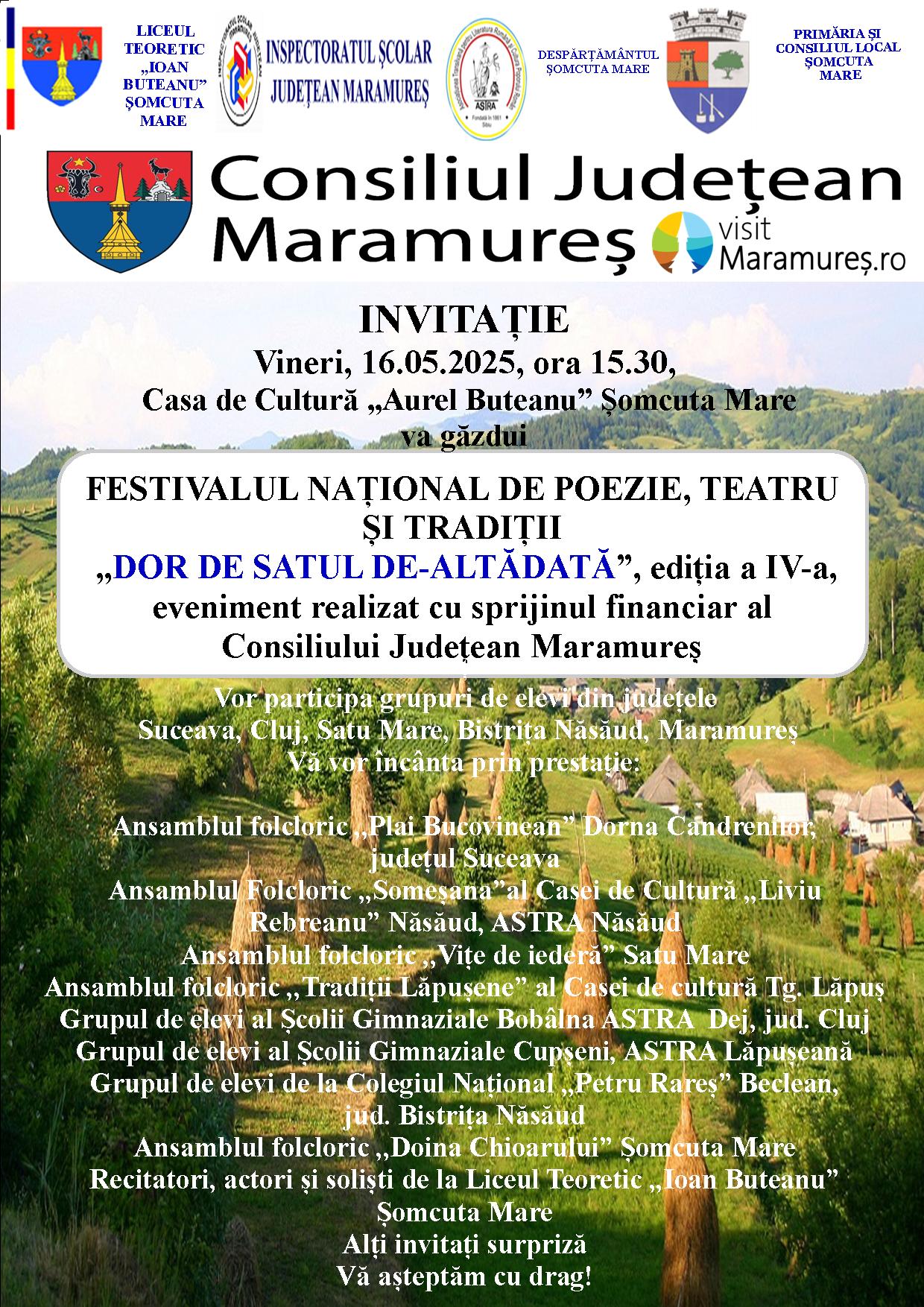 Vineri, 16 mai, de la ora 15.30, Casa de Cultură „Aurel Buteanu” Șomcuta Mare va găzdui ediția a IV-a a Festivalului Național de Poezie, Teatru și Tradiții „Dor de satul de-altădată”.