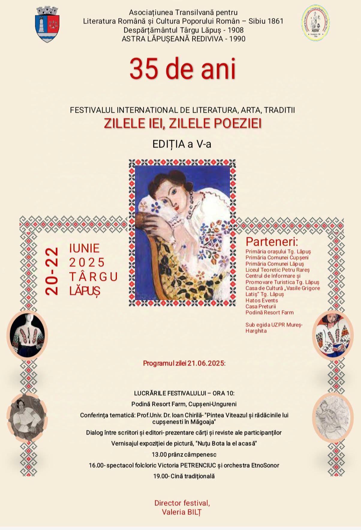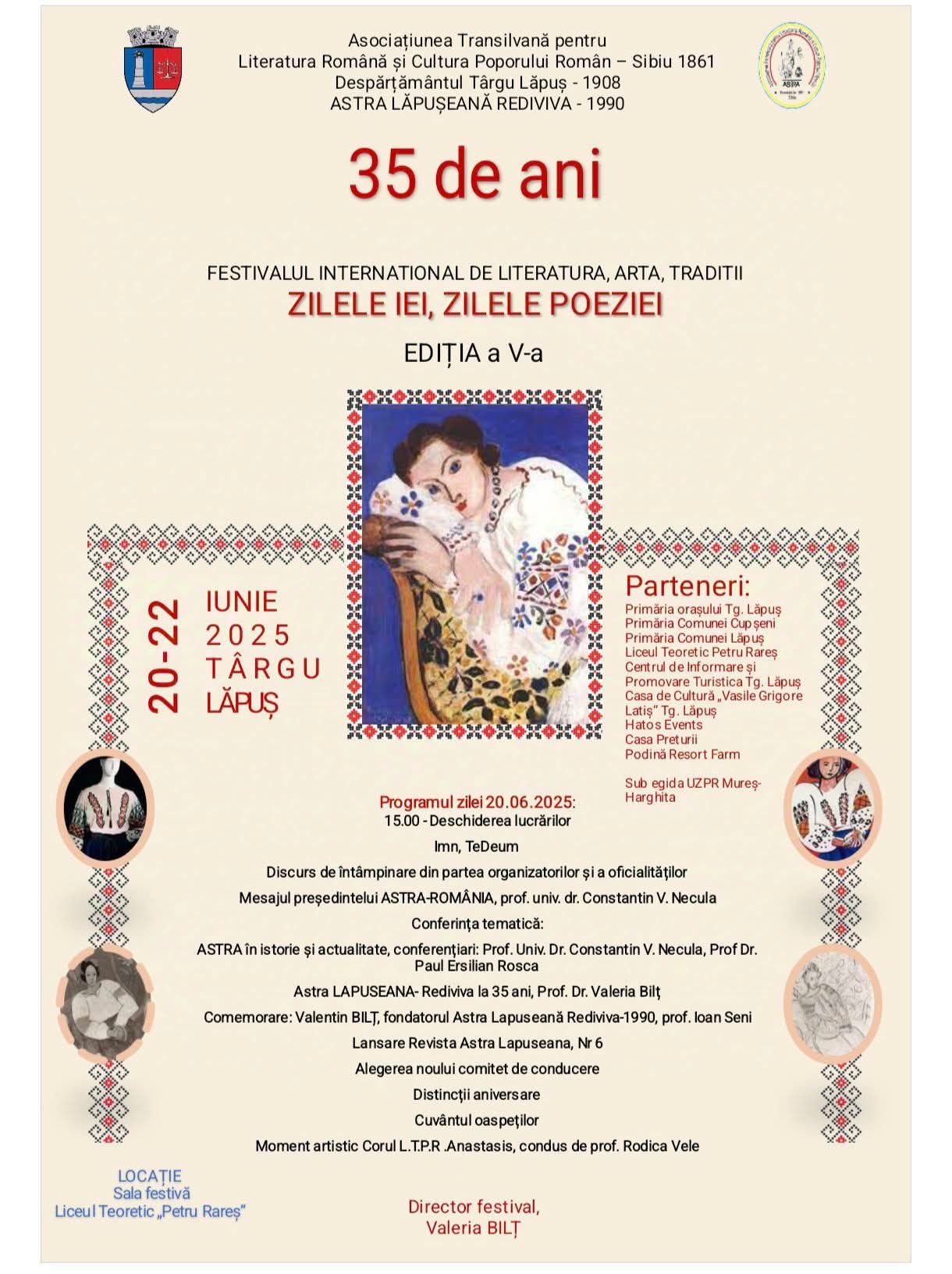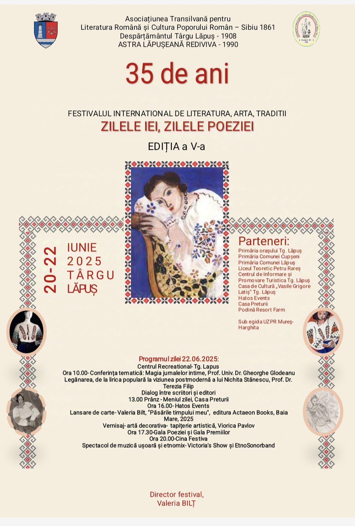În perioada 20-22 iunie, Târgu Lăpuș devine locul unei duble sărbători culturale de înaltă ținută. Asociația de Cultură „ASTRA LĂPUȘEANĂ” aniversează 35 de ani de la reînființare, într-un cadru festiv, solemn și totodată viu, la deschiderea oficială a „Festivalului Internațional de Literatură, Artă și Tradiții – Zilele Iei, Zilele Poeziei”, ediția a V-a (director festival prof. Valeria Bilț – foto)