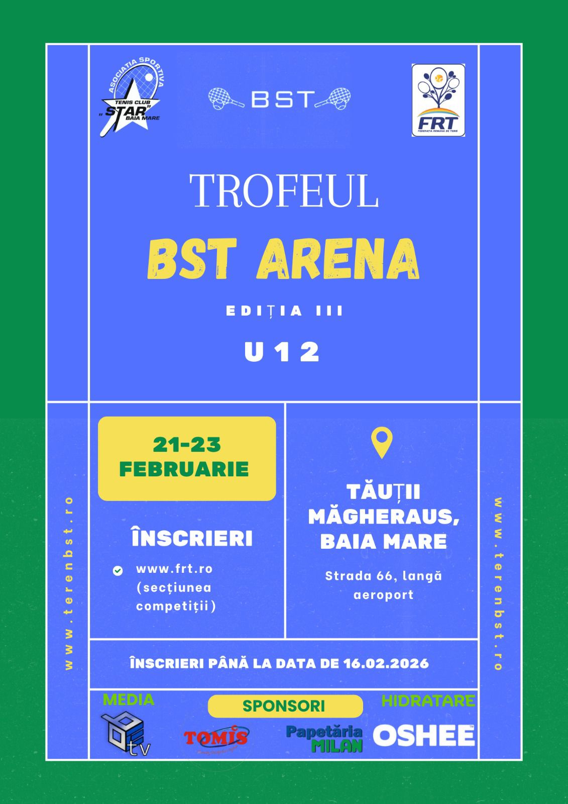 Un nou eveniment sportiv dedicat tinerelor talente ale tenisului va avea loc în perioada 21–23 februarie, la baza sportivă BST din Tăuții-Măgherăuș. Este vorba despre cea de-a III-a ediție a Trofeului BST Arena, competiție organizată sub egida Federației Române de Tenis.