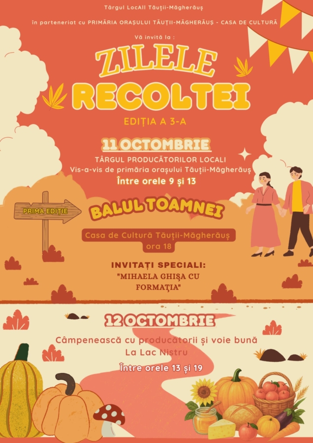 În perioada 11-12 octombrie, Târgul LocAll în parteneriat cu Casa de Cultură și Primăria orașului Tăuții-Măgherăuș organizează cea de-a treia ediție a Zilelor Recoltei, pentru a sărbători frumusețea toamnei și roadele muncii producătorilor locali din Tăuții-Măgherăuș.