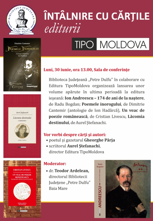 Luni, 30 iunie de la ora 13:00, în Sala de Conferințe a Bibliotecii Județene „Petre Dulfu” din Baia Mare va avea loc lansarea unor volume apărute în ultima perioadă la editura ieșeană „TipoMoldova”.