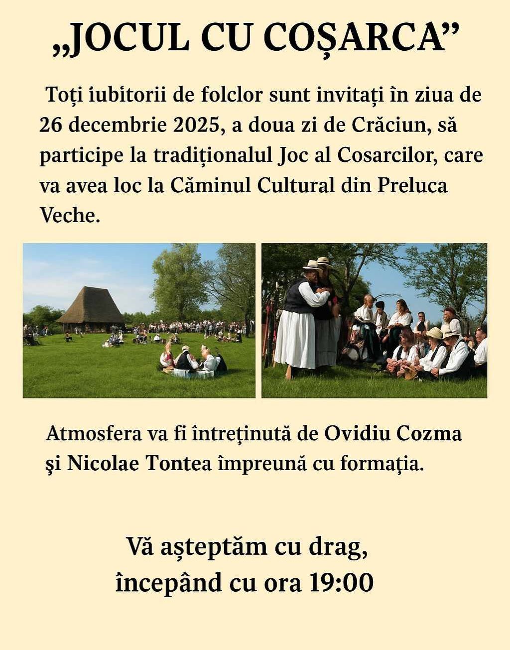 Căminul Cultural din Preluca Veche va găzdui în 26 decembrie, a doua zi de Crăciun, un nou eveniment dedicat tradițiilor. Iubitorii de folclor sunt invitați să participe la „Jocul cu Coșarca”, manifestare culturală ce va debuta începând cu ora 19:00.