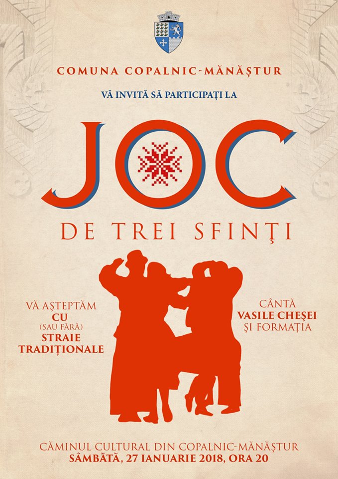 Un obicei, al cărui început se pierde în negura vremurilor, se desfăşoară în Copalnic-Mănăştur an de an, după acelaşi tipar ancestral. Sâmbătă, 27 ianuarie 2018, începând cu ora 20.00, la Căminul cultural din Copalnic-Mănăştur are loc Jocul de Trei Sfinţi, la care sunt aşteptaţi să vină mănăşturenii şi nu numai ei, îmbrăcaţi în straie tradiţionale, şi nu numai. După cum afirmă primarul Vasile Mihalca, totul se păstrează ca acum sute de ani: de la dansul coşercilor şi portul tradiţional, până la muzica interpretată de violonistul Vasile Cheşei şi de formaţia sa. Evenimentul este organizat de Primăria Comunei Copalnic-Mănăştur. (D.G.B.)