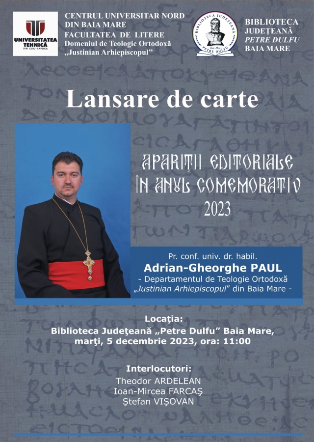 De această dată, ziua de 5 decembrie este rezervată unei lansări de carte. Partener, alături de instituție, va fi Centrul Universitar Nord Baia Mare – Facultatea de Litere, Domeniul de Teologie Ortodoxă „Justinian Arhiepiscopul”.