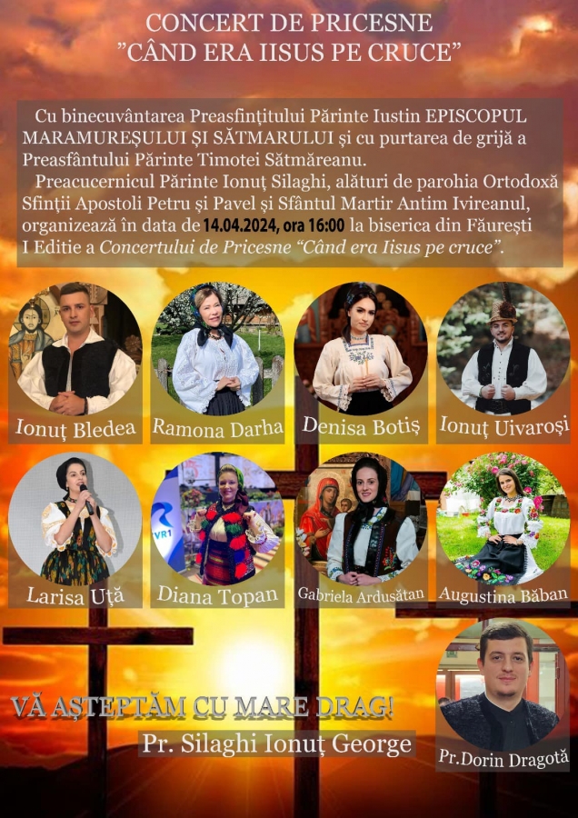 Duminică, 14 aprilie, de la ora 16.00, la biserica din Făurești (pr. paroh Silaghi Ionuț-George) va avea loc prima ediție a concertului de pricesne „Când era Iisus pe cruce”.