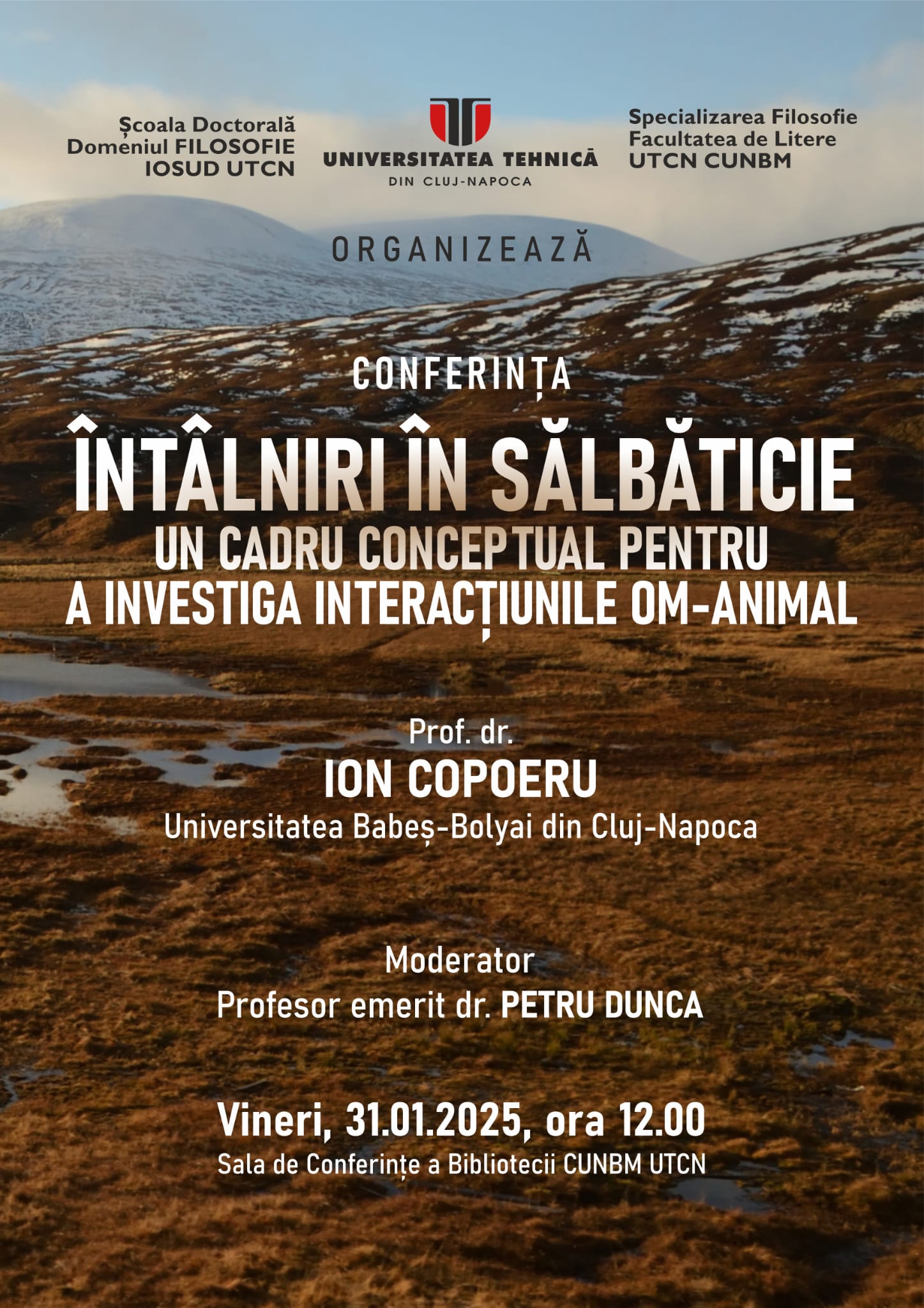 Vineri, 31 ianuarie, de la ora 12.00, Sala de conferințe a Bibliotecii Centrului Universitar Nord Baia Mare va găzdui conferința „Întâlniri în sălbăticie. Un cadru conceptual pentru a investiga interacțiunile om-animal”.