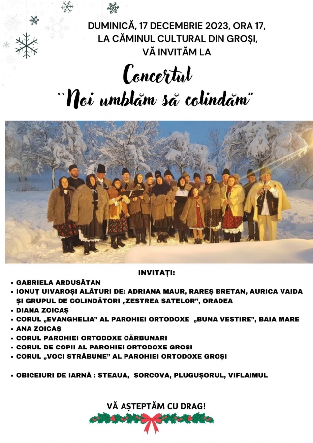 Azi după-amiază, 17 decembrie, de la ora 17.00, Căminul Cultural din Groși va găzdui Concertul „Noi umblăm să colindăm”.