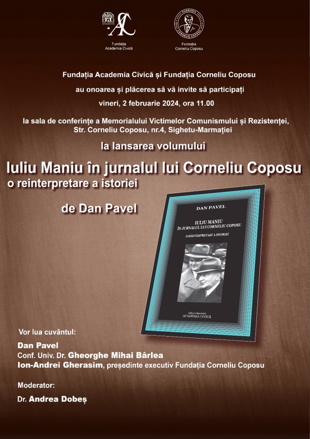 Vineri, 2 februarie, la ora 11:00, în sala de conferințe a Memorialului Victimelor Comunismului și al Rezistenței din Sighetu Marmației va avea loc lansarea cărții ”Iuliu Maniu în jurnalul lui Corneliu Coposu. O reinterpretare a istoriei” de Dan Pavel.