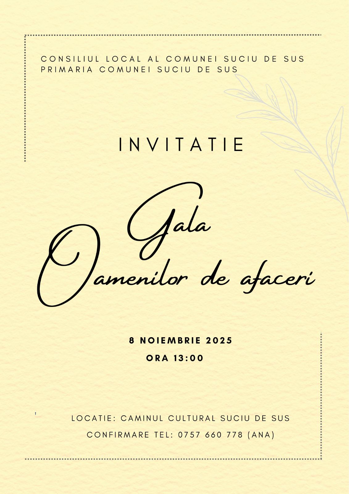 Consiliul Local al Comunei Suciu de Sus și Primăria Comunei Suciu de Sus organizează „Gala Oamenilor de Afaceri”, un eveniment deosebit dedicat mediului antreprenorial din zonă.