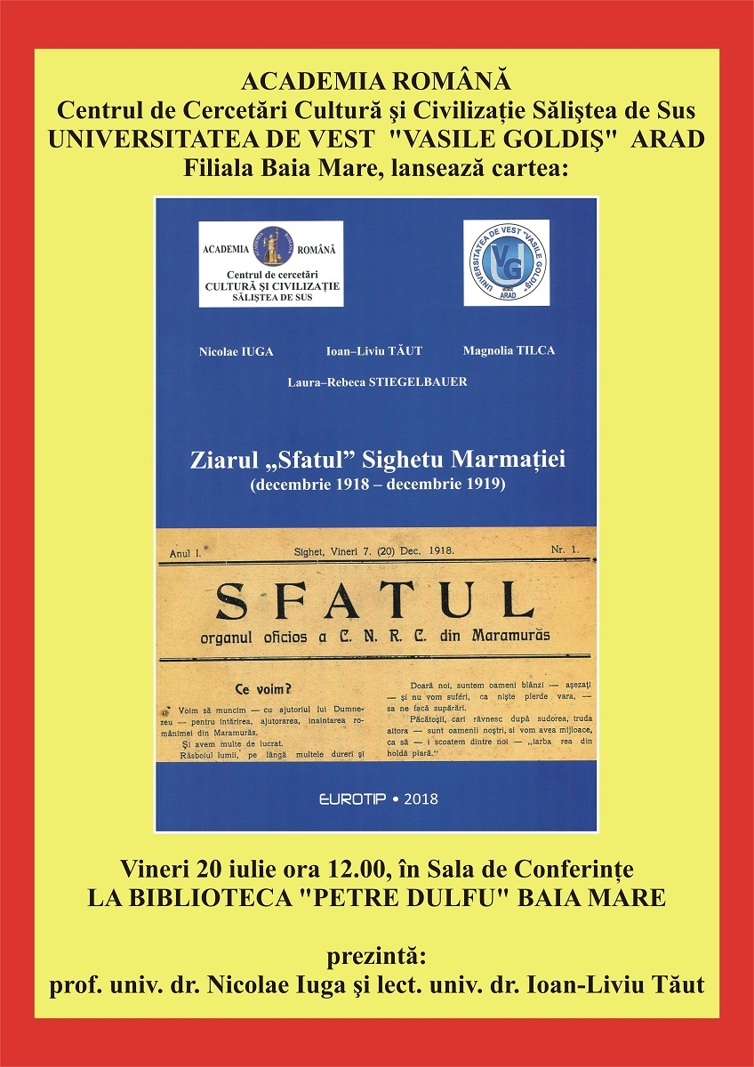 Vineri, 20 iulie, începând cu ora 12,00, sala de conferințe a Bibliotecii Județene ”Petre Dulfu” Baia Mare va găzdui lansarea volumului ”Ziarul «Sfatul» – Sighetu Marmaţiei (decembrie 1918 – decembrie 1919)”. Lucrarea, apărută la Editura Eurotip, Baia Mare, 2018, este semnată de prof. univ. dr. Nicolae Iuga, lect. univ. dr. Ioan-Liviu Tăut, Magnolia Tilca, Laura-Rebeca Stiegelbauer. Evenimentul este organizat de Centrul de Cercetări, Cultură şi Civilizaţie Săliştea de Sus şi Filiala Baia Mare a Universităţii de Vest „Vasile Goldiş”.