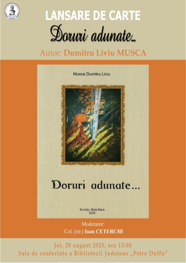Joi, 28 august, Biblioteca Județeană „Petre Dulfu” Baia Mare organizează lansarea volumului de poezii intitulat „Doruri adunate…”, de Dumitru Liviu Musca, volum apărut la Editura Eurotip. Evenimentul va avea loc în sala de conferințe, de la ora 13:00.