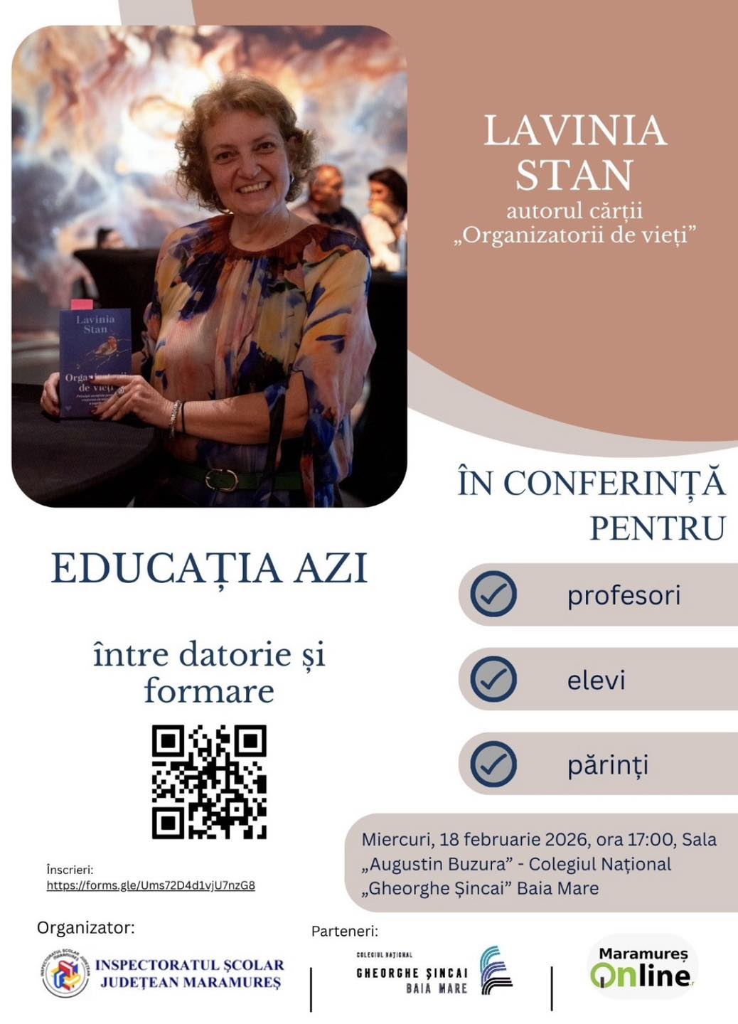 Inspectoratul Școlar Județean Maramureș organizează miercuri, 18 februarie, de la ora 17:00, la Colegiul Național „Gheorghe Șincai” (sala „Augustin Buzura”), o întâlnire cu Lavinia Stan, autorul cărții „Organizatorii de vieți”.